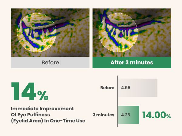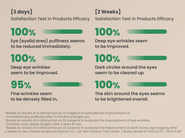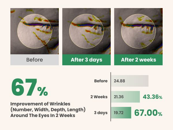 • 43% improvement in eye wrinkles (number, area, depth, length) after 3 days