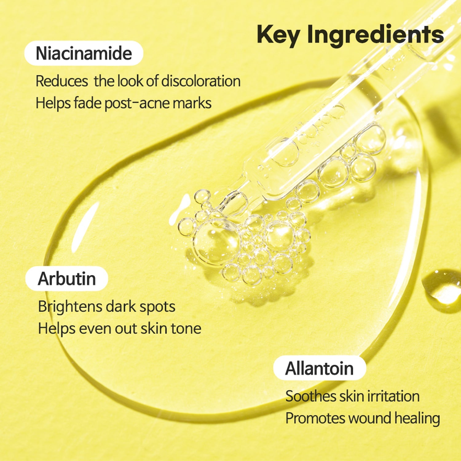 Water, Niacinamide(Vitamin B3; 10%), Butylene Glycol, Arbutin(2%), Allantoin, Dipotassium Glycyrrhizate, Lindera Erythrocarpa Extract, Cornus Officinalis Fruit Extract, Geranium Thunbergii Extract, Hydroxyethylcellulose, Sodium Hyaluronate, Methylpropanediol, Laurylpyridinium Chloride, Chlorphenesin, 1,2-Hexanediol